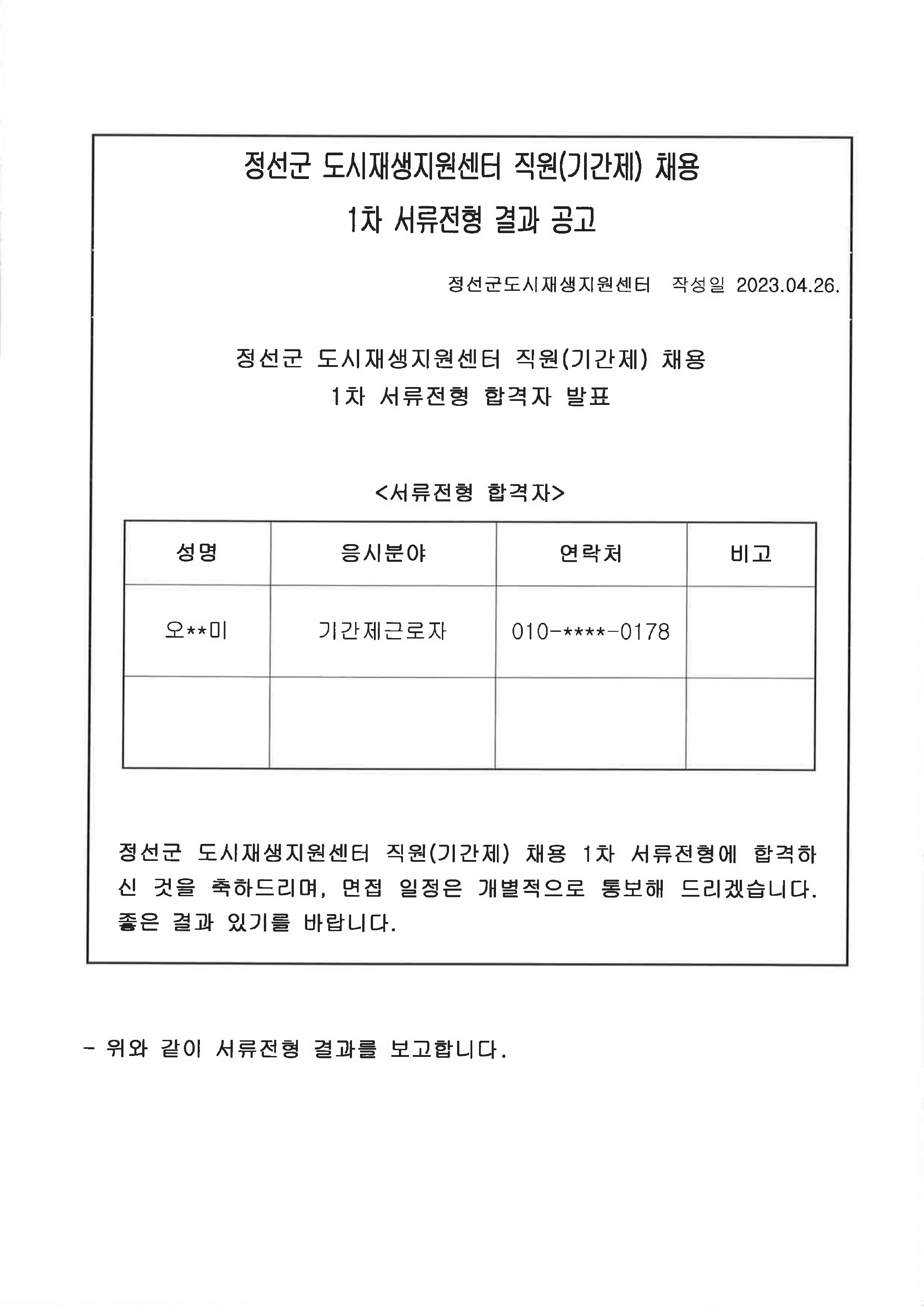 | [공고] 정선군 도시재생지원센터 직원(기간제) 채용 결과 공고 (0) | 2023.04.28 |