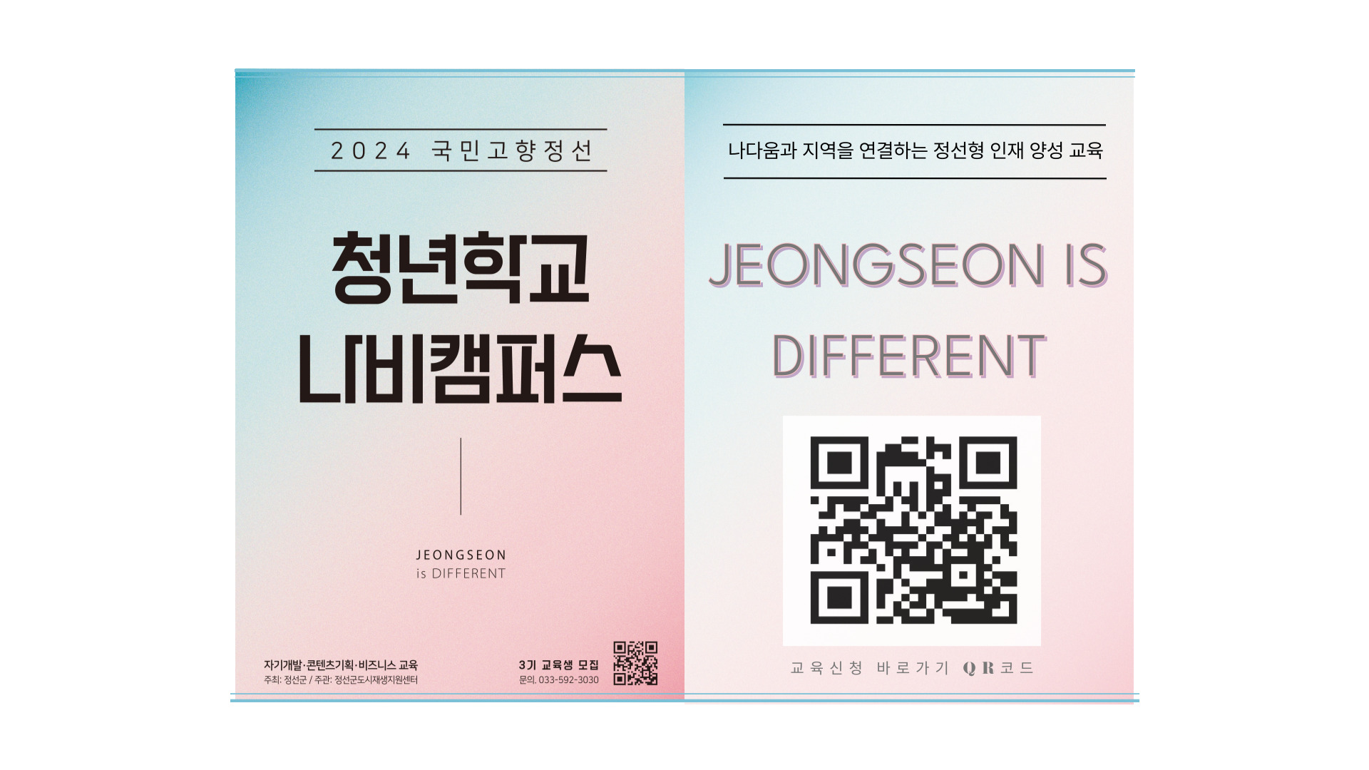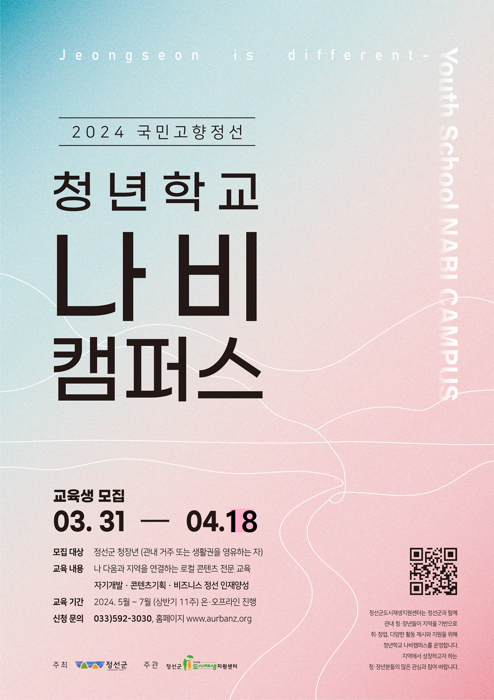 | [홍보] 국민고향정선 청년학교 나비캠퍼스 3기 모집 홍보영상 (0) | 2024.03.25 |