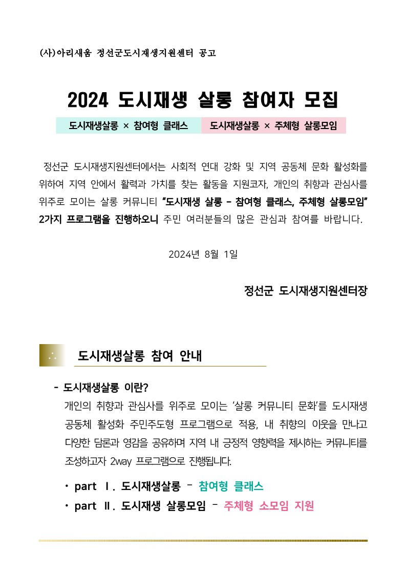 | [공지] 2024 도시재생살롱 - 참여형 클래스 참여자 모집 (0) | 2024.08.01 |