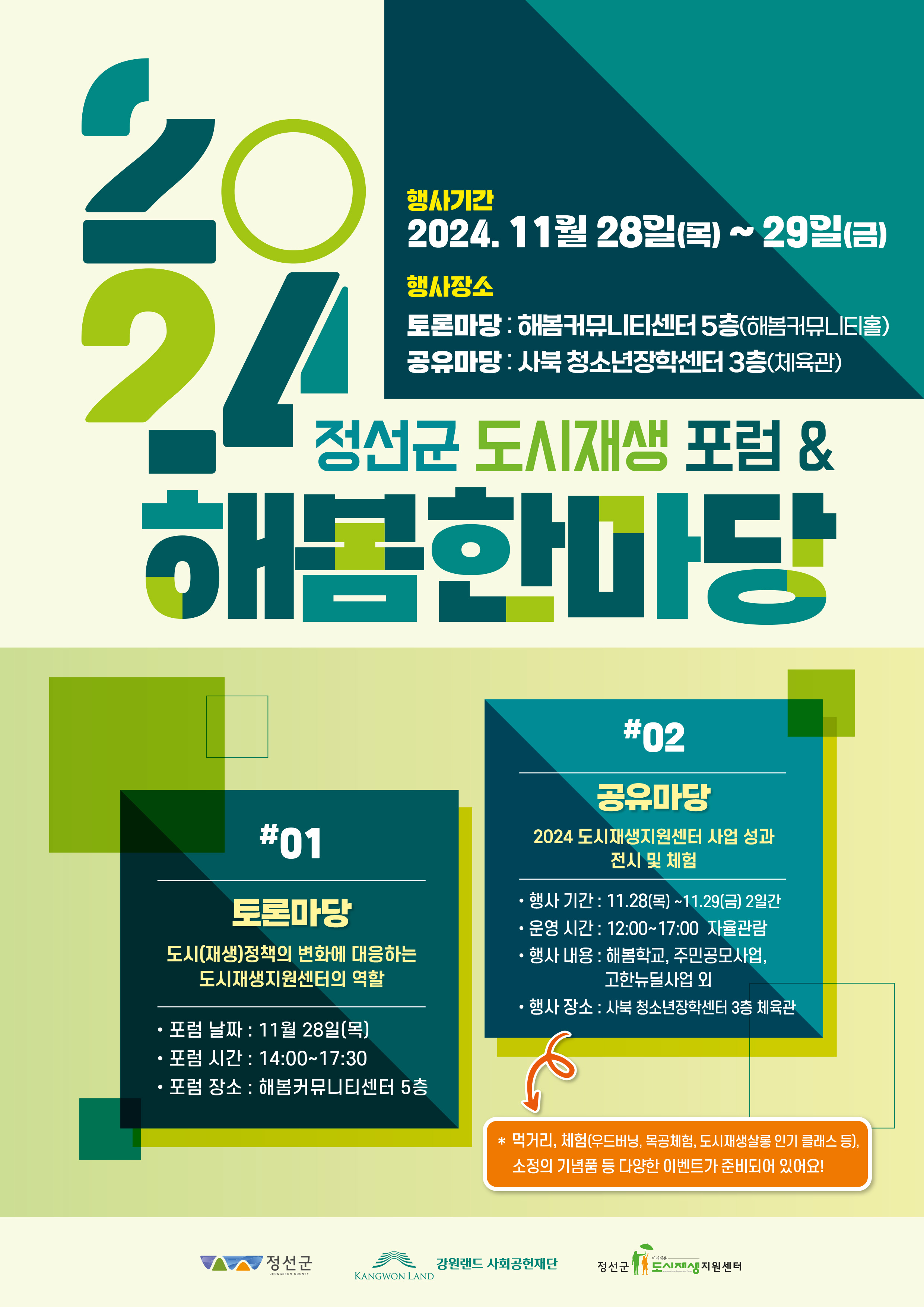 행사내용: 정선군도시재생지원센터 사업 성과공유 전시 및 체험, 홍보, 먹거리 부스 운영