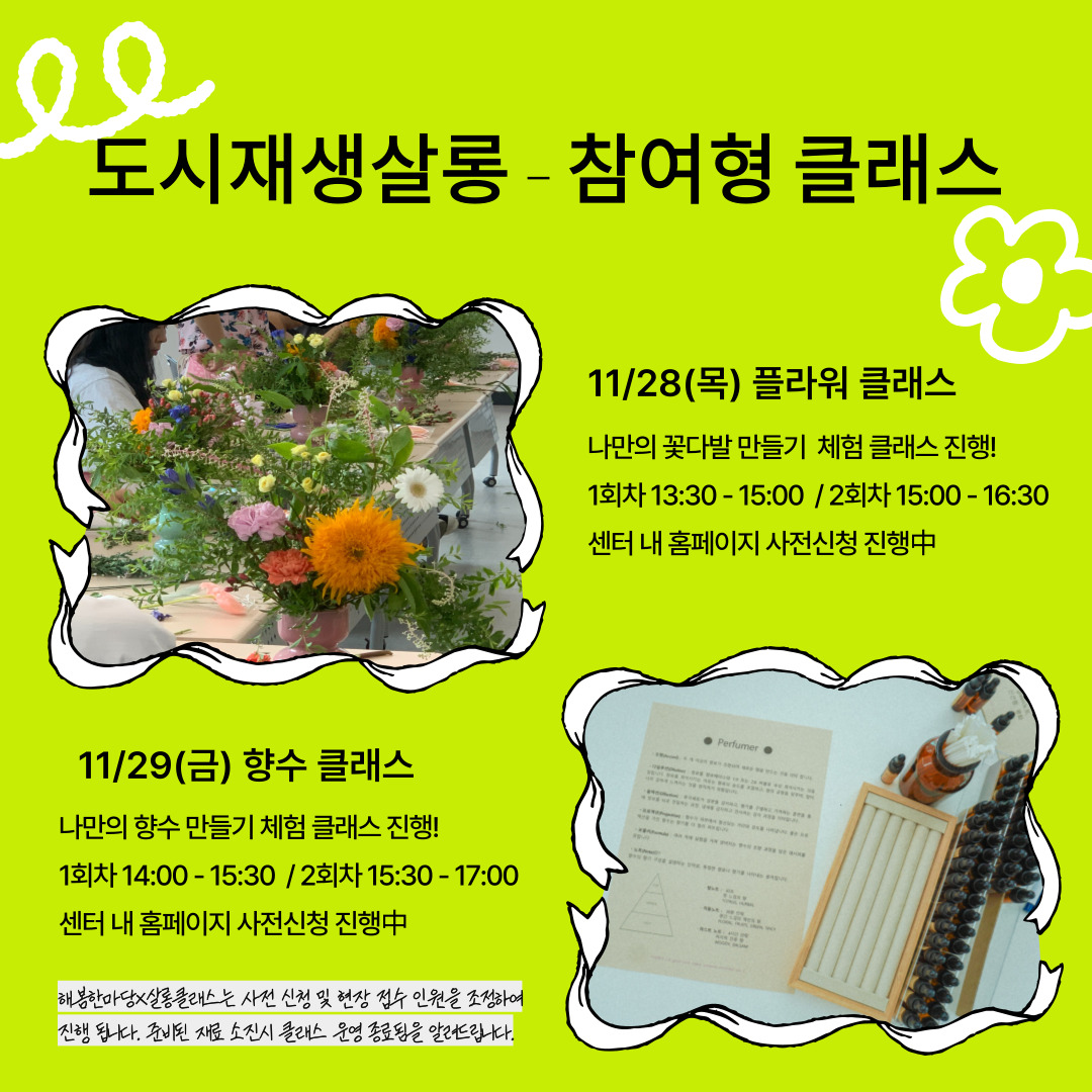 | 11/28(목) | 도시재생살롱클래스 "꽃다발 만들기 - 플라워 클래스" | 1일 2회 운영 (사전 접수 종료 후 당일 현장접수) |