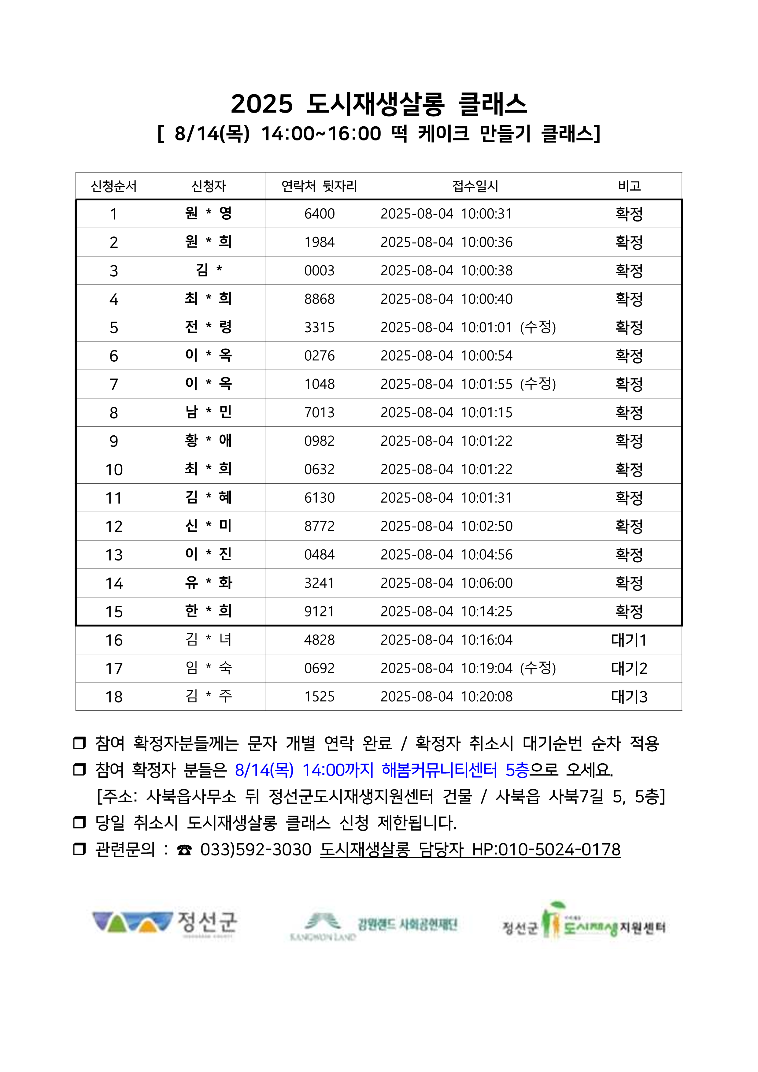 모집인원 15명 + 대기인원 3명 (신청취소 발생시 대기순번 순차 적용)