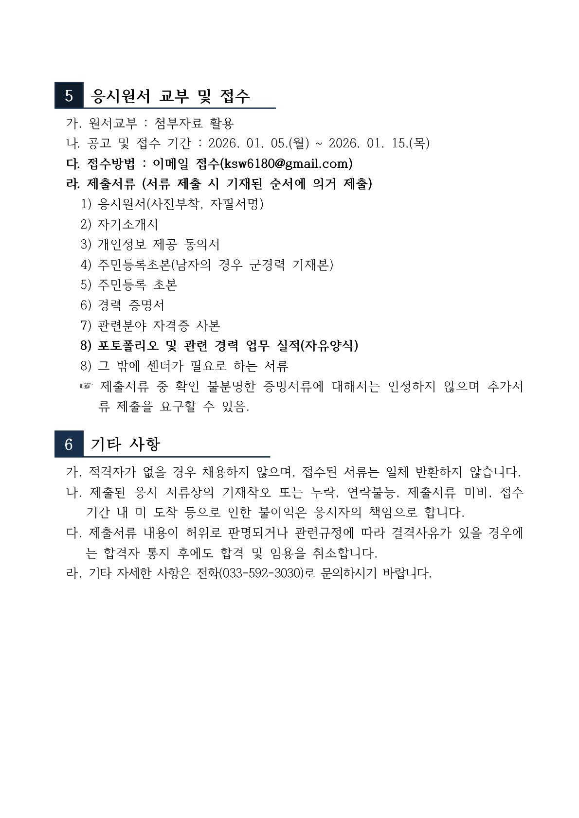 | [공고] 정선군 도시재생지원센터 팀원(상근) 채용 공고 (0) | 2026.01.05 |