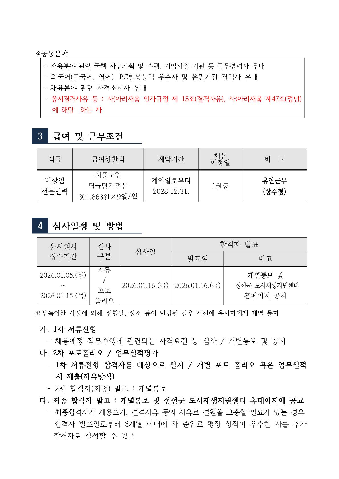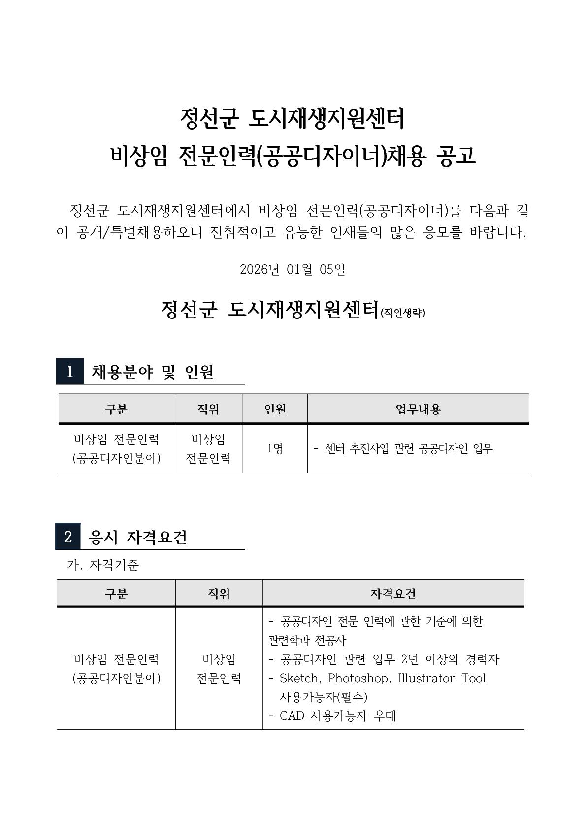 | [공고] 정선군 도시재생지원센터 팀원(상근) 채용 공고 (0) | 2026.01.05 |