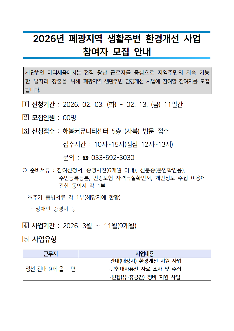 | [공고] 정선군 도시재생지원센터 팀원(상근) 채용 공고 (0) | 2026.01.05 |