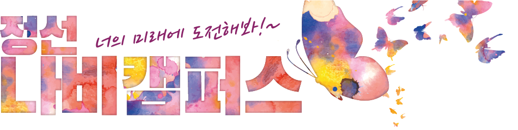 정선 나비캠퍼스 (Nabi Campus)자연상태에서 애벌레가 나비로 성장할 확률은 1%.하지만 나비가 된 후에는 아름다운 외관과 함께 자신을 보호하고 후세대를 생산할 수 있는 생존능력을 갖추게 됩니다.자연 속에서 애벌레가 나비로 성장하듯인재를 발굴하여 정선 지역 문화경제의 핵심인재로 성장시키자는 프로젝트로 시작되었습니다.