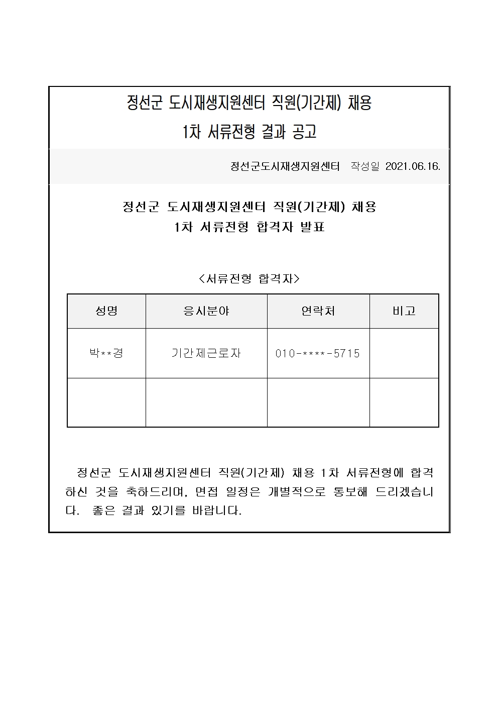 | [공시·공고] 정선군 도시재생지원센터 기간제근로자 모집 공고 (0) | 2021.06.16 |