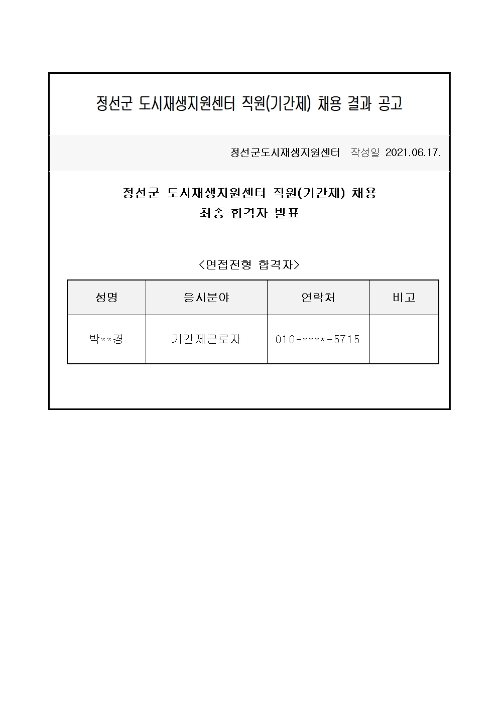 | [공시·공고] 정선군 도시재생지원센터 직원(기간제) 채용 1차 서류전형 결과 공고 (0) | 2021.06.16 |