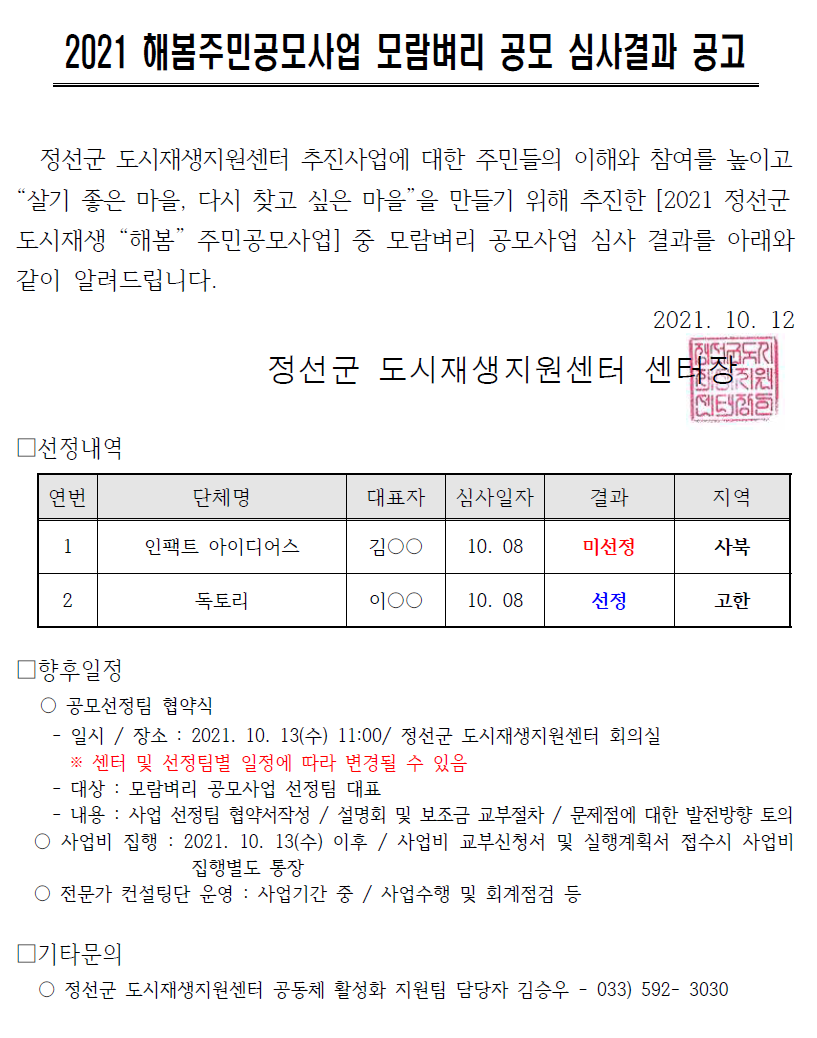 | [공시·공고] 2021 해봄주민공모사업(작은실천) 3차 선정결과 공고 (0) | 2021.09.28 |