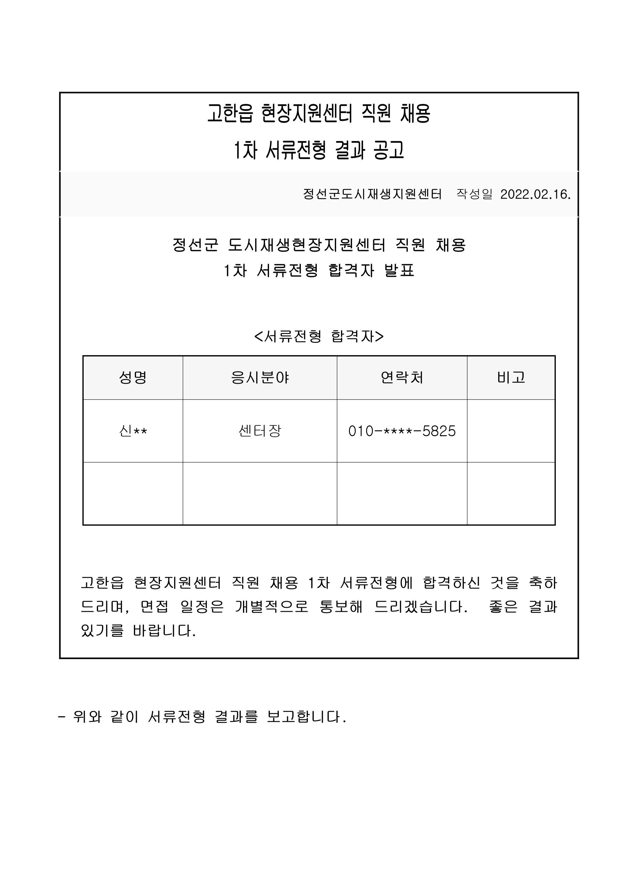 | [공시·공고] 정선군 도시재생지원센터 직원(기간제) 채용 1차 서류전형 결과 공고 (0) | 2022.01.12 |